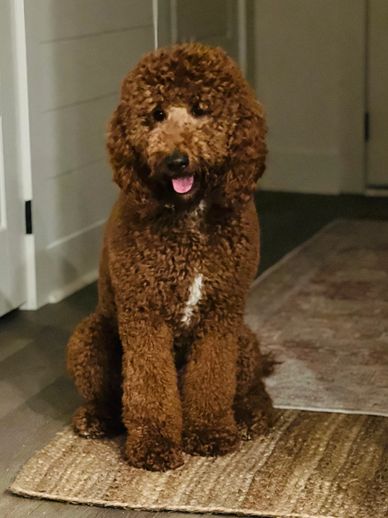 Hattie-Mae is our beautiful AKC deep red Poodle. She is 52lbs and is 25” from the withers. She loves everyone she meets and her people something fierce. Hattie-Mae is our real life teddy bear and loves her scrambled eggs, and peanut butter sandwiches.