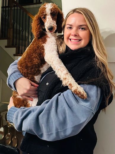 Yep, there’s a new parti in town! Her name is Marley and she is our smaller standard parti poodle. Marley will be welcoming our first Moyen Poodle Parti litter in 2023. Marley loves to cuddle and gives hugs just like her Dad, Benny.